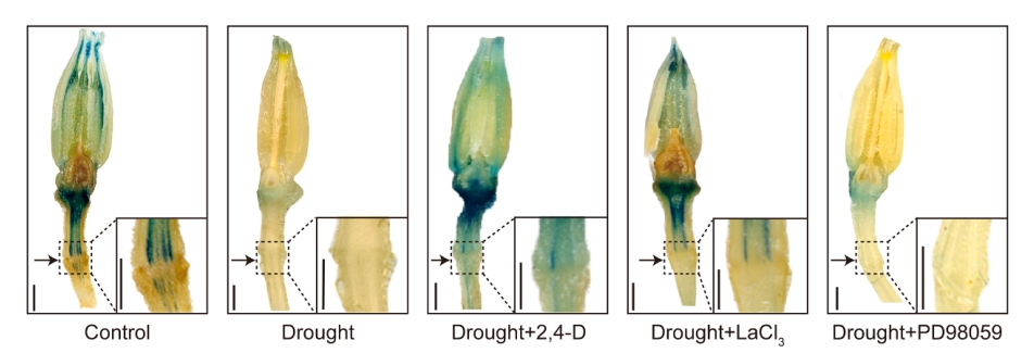 該研究發(fā)現(xiàn),干旱脅迫下SlCBL11/SlCIPK10-SlLHP1b信號模塊誘導(dǎo)番茄落花的作用機制。干旱脅迫激活SlCBL11-SlCIPK10鈣離子感受器模塊,磷酸化修飾SlLHP1b。磷酸化的SlLHP1b通過H3K27me3依賴的方式結(jié)合下游生長素合成基因SlYUCs的啟動子區(qū)域抑制其表達(dá),導(dǎo)致雄蕊中生長素合成減少,破壞離區(qū)生長素梯度,誘發(fā)番茄落花。該研究揭示了干旱下鈣信號通過表觀遺傳調(diào)控生長素合成參與番茄落花的分子機制,進(jìn)一步完善了植物逆境響應(yīng)中鈣信號與表觀遺傳調(diào)控的分子網(wǎng)絡(luò),還為培育耐旱、高產(chǎn)的品種提供了潛在的基因靶點。研究成果對提高逆境下的番茄產(chǎn)量,提高經(jīng)濟(jì)效益具有重要的指導(dǎo)意義。該研究獲國家重點研發(fā)計劃項目、國家自然科學(xué)基金面上項目和青年科學(xué)基金等項目支持。
