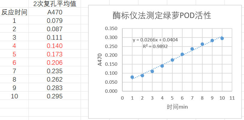 取0.5 克綠蘿葉片,加入5 ml提取液冰浴勻漿,制成10%勻漿液,12000 rpm 4℃離心10 min,取上清置于冰上,按照測定步驟操作,三個復孔,設定酶標儀檢測波長470 nm,間隔1 min采集數(shù)據(jù),采集10次;時間對吸光值做線性回歸曲線,4-6 min線性較好,2 min內△A=0.225-0.130=0.095。