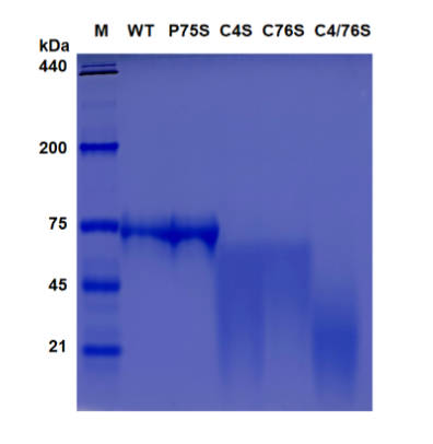 單體蛋白分子量為75 kD,在Tris-甘氨酸非變性下表現(xiàn)為分子量~75 kD,同時(shí)會(huì)形成少量二聚體(dimer)