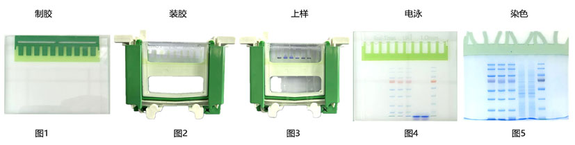 圖1和圖2為使用PAGE上層膠綠色染料配制的上層膠被染成綠色,上樣孔一目了然,易于判斷上樣孔是否歪曲或破損;圖3是上樣后的效果圖,上層膠和樣品非常清晰;圖4為預(yù)染蛋白分子量Marker電泳后的效果,染料保留在上層膠中,不會(huì)隨著電泳而遷移;圖5為凝膠染色后的效果,樣品分離清晰,泳道無豎條拖尾,染料不影響電泳結(jié)果。