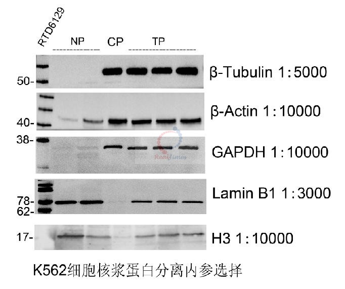 蛋白分區(qū)提取的質(zhì)量評價(jià)首先看提取的蛋白是否是分區(qū)蛋白,其次要看分區(qū)蛋白是否有明顯的富集,其三要看提出的分區(qū)蛋白是否有其他組分交叉污染,最后看提取的分區(qū)蛋白中是否可以檢測出目的蛋白。使用專門的胞漿內(nèi)參和細(xì)胞核檢測(下表),可以初步確認(rèn)提出的是胞漿蛋白還是核蛋白。蛋白是否有效富集需要用總蛋白作為對照,與總蛋白相比,胞漿蛋白內(nèi)參或核內(nèi)參是否有明顯富集。交叉污染可以用其他組分內(nèi)參檢測蛋白樣品,如關(guān)注胞漿蛋白中是否有細(xì)胞核蛋白污染,可以使用核蛋白內(nèi)參如Lamin B1檢測胞漿蛋白,檢測無條帶即說明胞漿蛋白與細(xì)胞核組分無交叉污染。用目標(biāo)蛋白抗體檢測分區(qū)蛋白,驗(yàn)證是否可以檢測到目的蛋白,蛋白大小是否符合預(yù)期。