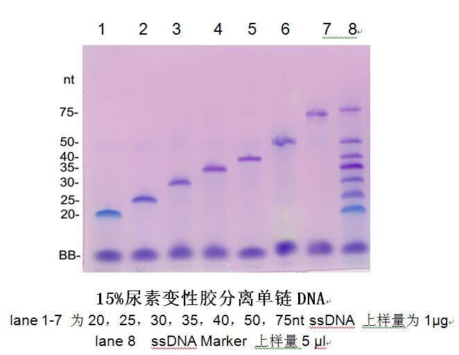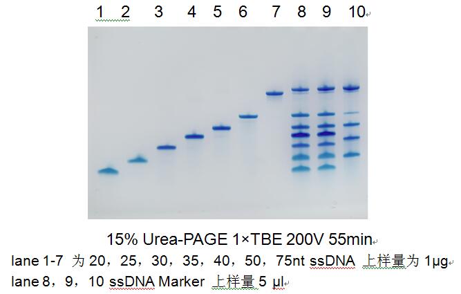 TBE-尿素-PAGE電泳可以選擇RTM501 單鏈DNA Marker(25-75 nt)和RTM506 單鏈DNA Marker (15-120nt)作為分子量標(biāo)準(zhǔn)。