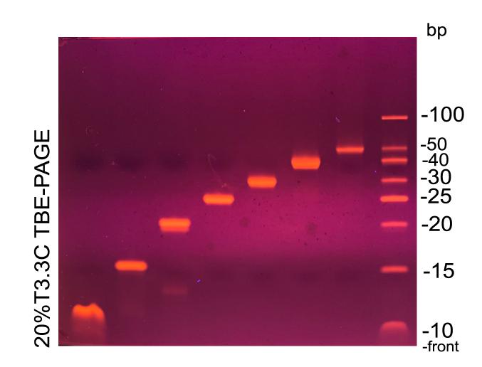 本產(chǎn)品是由8條帶狀雙鏈DNA條帶組成的精準(zhǔn)定量Marker,8條帶的大小分別為10,15,20,25,30,40,50,100bp。其中25 bp條帶為加亮帶,含量為100 ng/5 μl,其余條帶濃度為50ng/5μl。本產(chǎn)品為雙鏈DNA Marker,適用于非變性的PAGE電泳,不適用于尿素PAGE電泳。由于片段長度很短,不建議用瓊脂糖凝膠電泳分離。