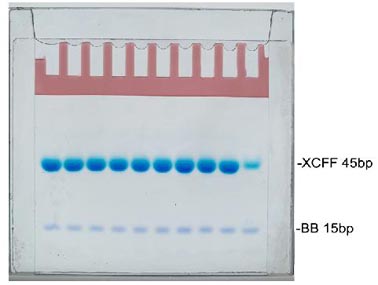 2.2 取待測樣品,加入相應(yīng)體積6×Native PAGE DNA上樣緩沖液,如5 μl樣品加1 μl 上樣緩沖液,短暫離心后取5-10 μl上樣。 10 bp DNA ladder  1 mm厚10齒梳子上樣5 μl,其余梳齒和厚度凝膠適量調(diào)整上樣量。