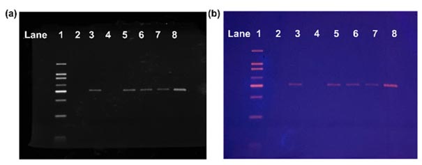 凝膠浸泡于即用型染色液中,常溫避光搖床40-60 rpm染色30 分鐘。紫外光下觀察。